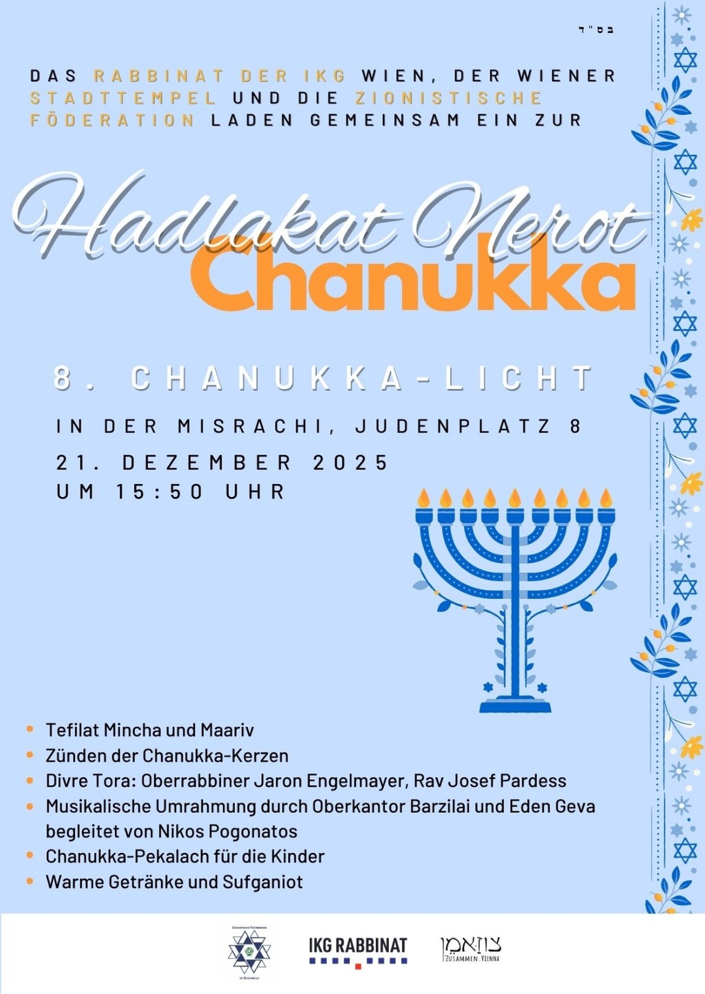 Arzenu Austria, together with the Rabbinical Council of the IKG Vienna, the Vienna City Temple, and as a co-organiser within the Zionist Federation of Austria (ZFÖ), invites you to the lighting of the 8th Chanukah candle.